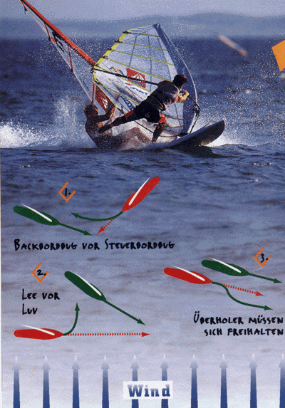1. Surfer untereinander: Das Wegerecht auf dem Wasser nimmt immer beide "Verkehrsteilnehmer" in die Pflicht. Es gibt einen Ausweichpflichtigen und einen Kurshaltepflichtigen. Droht eine Kollision, muß im Zweifel auch der Surfer mit Vorfahrt das "Manöver des letzten Augenblicks" fahren - je nach Können ein kühles Bad oder eine Powerhalse. Auf direktem Konfrontationskurs genießt der Surfer das Vorrecht, der die rechte Hand vorne (am Mast) hat. Diese Regel nennen Surfer und Segler Backbordbug vor Steuerbordbug. Dabei muß derjenige klein beigeben, der das Segel in Fahrtrichtung gesehen auf der rechten Seite (Steuerbord) hält. Haben zwei oder mehrere Surfer den Wind von der gleichen Seite, während sich ihre Wege zu kreuzen drohen, dann gilt die Regel Lee vor Luv. In diesem Fall muß der Surfer ausweichen, der höher am Wind fährt. Für Geschwindigkeitsrekordler gibt es auf dem Wasser kein Tempolimit, aber eine anderweitige Verpflichtung: Überholer müssen sich freihalten. Bei jedem Überholvorgang gilt: mindestens zwei Mastlängen Abstand halten. Vorfahrt in der Welle: Handfeste Diskussionen können vermieden werden, wenn man sich in der Brandung an folgende Regeln hält: Wer durch die Brandungszone hinausfährt, hat Vorrang gegenüber dem, der mit der Welle in Richtung Ufer surf. Wenn allerdings Ausweichen möglich ist, sollte man einen schönen Wellenritt nicht behindern. Beim Absurfen gilt: Wer die Welle zuerst hat, dem gehört sie auch. Reiten mehrere Surfer eine Welle gleichzeitig ab, hat derjenige Vorfahrt, der näher an der brechenden Lippe surft. Wellenreitern sollte man grundsätzlich den Vortritt lassen und am besten nicht in die Anpaddel-Zone hineinsurfen. 2. Surfer und andere Wasserfahrzeuge: Seit dem 22.10.98 werden