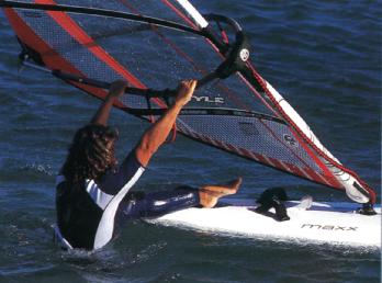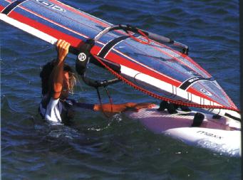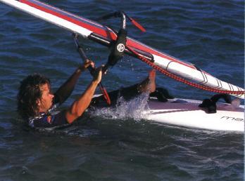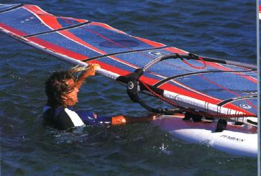 | Oliver hat das Heck unter die Gabel gedrückt und schwimmt jetzt rückwärts, damit auch das Schotthorn vollkommen aus dem Wasser kommt. Übrigens lässt sich auch ein dicker Brett-Hintern runterdrücken. Das ist immer noch leichter, als das Rigg übers Brett zu ziehen. | Das Segel wird angeströmt und erleichtert dem Starter das Ziehen übern Kopf beträchtlich. Das Brett hält Oliver mit der Hand in der idealen Halbwindposition. |