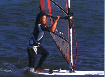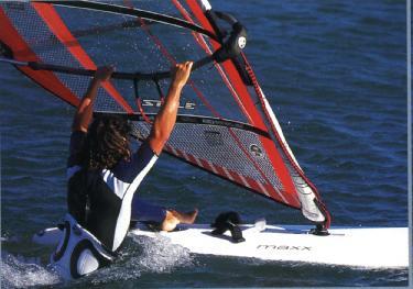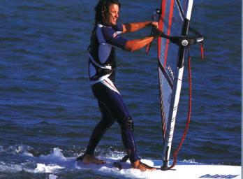 | Oliver mach sich jetzt ganz lang und gibt dem Segelzug nach. Auf das hintere Bein kommt nun allmählich Belastung, während das Brett langsam Fahrt aufnimmt. | Das Rigg steht aufrecht, dem Vortrieb steht also nichts mehr im Weg. Das Brett wird durch das hintere Bein und durch Druck auf den Mastfuß belastet. |