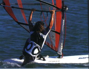 | Nun endlich kommt der oft zitierte Klimmzug (und nicht vorher): Der Starter hievt sich ganz hoch und betrifft auch mit dem vorderen Fuß das Deck. | Geschafft: Das Segel, das aufgefiert war, um Böen durchrauschen zu lassen und keinen Schleudersturz zu riskieren, wird nun dicht genommen - und ab geht die Post. |